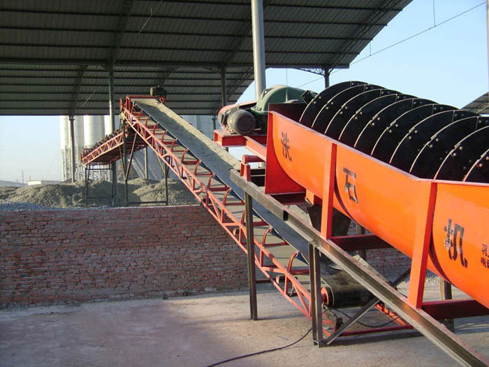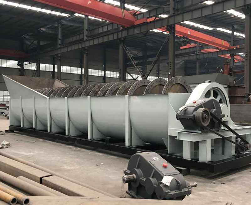 螺旋洗砂機(jī)轉(zhuǎn)子采用中心結(jié)構(gòu),設(shè)備的螺旋葉片安裝在中心軸上,由減速器連接到中心軸上進(jìn)行工作。在工作狀態(tài)下,螺旋洗砂機(jī)借助固體顆粒的比重和大小不同,因而在液體中沉降的速度不同的原理,從而實現(xiàn)細(xì)礦粒浮游在水中成溢流出,粗礦粒沉于槽底,由螺旋推向上部排出進(jìn)行機(jī)械分級和物料清洗。